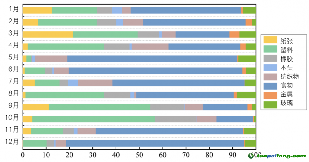 圖2. 2021年上海市某生活垃圾焚燒廠接收的垃圾組分(濕重)隨月份的變化(編者根據(jù)該研究英文圖片翻譯,下同)