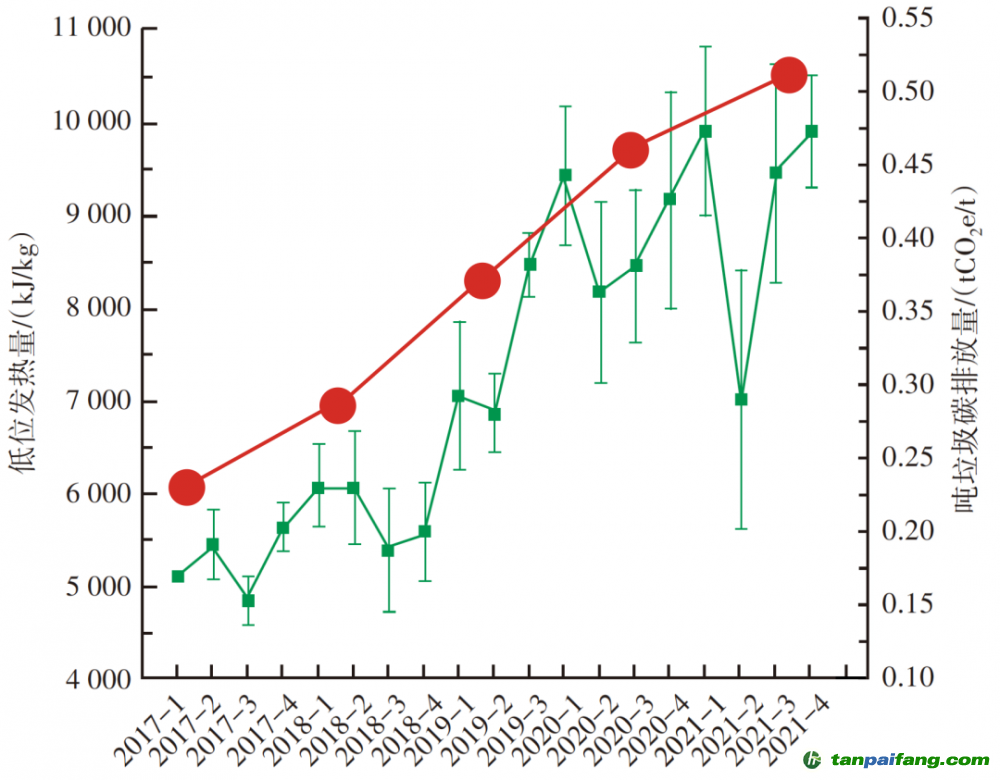 圖3.2017—2021年蘇州市某垃圾焚燒廠進(jìn)廠垃圾低位發(fā)熱量、單位碳排放 禸嫆@唻洎:狆國(guó)湠棑倣茭昜蛧 τāńpāīfāńɡ.cōm