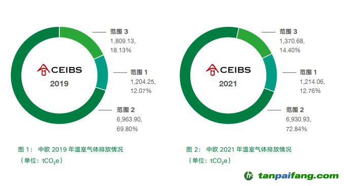 報告將2019年設(shè)為基準年,并選取近三年中運營活動數(shù)據(jù)較為正常的2021年作為跟蹤評估年,全面評估和掌握學(xué)院溫室氣體排放情況。數(shù)據(jù)表明,2019年中歐五大校區(qū)溫室氣體排放總量為9,977.29 tCO2e,2021年溫室氣體排放總量為9,515.13 tCO2e。相較于2019年,2021 年中歐溫室氣體排放總量下降4.63%。 本文@內(nèi)/容/來/自:中-國-碳^排-放-交易&*網(wǎng)-tan pai fang . com