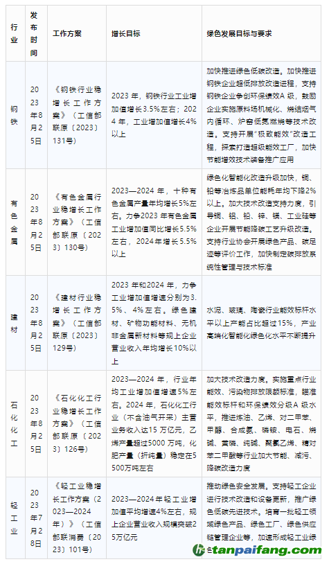 8月以來,鋼鐵、有色金屬、建材、石化化工、輕工等工業(yè)領(lǐng)域多行業(yè)穩(wěn)增長工作方案陸續(xù)出臺,統(tǒng)籌推進工業(yè)經(jīng)濟穩(wěn)增長和高質(zhì)量發(fā)展,其中,綠色低碳改造是推進各行業(yè)高質(zhì)量增長的重要內(nèi)容(見表1),如鋼鐵行業(yè)穩(wěn)增長方案提出加快推進鋼鐵企業(yè)超低排放改造進程,支持開展“極致能效”改造工程,探索打造超級能效工廠;有色金屬行業(yè)穩(wěn)增長方案提出加大技術(shù)改造支持力度,銅、鉛等冶煉品單位能耗年均下降2%以上;建材行業(yè)穩(wěn)增長工作方案提出2023~2024年,水泥、玻璃、陶瓷行業(yè)能效標(biāo)桿水平以上產(chǎn)能占比超過15%。系列政策的出臺將帶動工業(yè)領(lǐng)域綠色低碳節(jié)能改造需求的提升,8月GPI調(diào)研結(jié)果顯示,節(jié)能技術(shù)推廣服務(wù)行業(yè)新訂單指數(shù)較上月大幅提升了10.7個百分點,行業(yè)景氣也較上月大幅提升了8.8個百分點(見圖3)。 禸嫆@唻洎:狆國湠棑倣茭昜蛧 τāńpāīfāńɡ.cōm