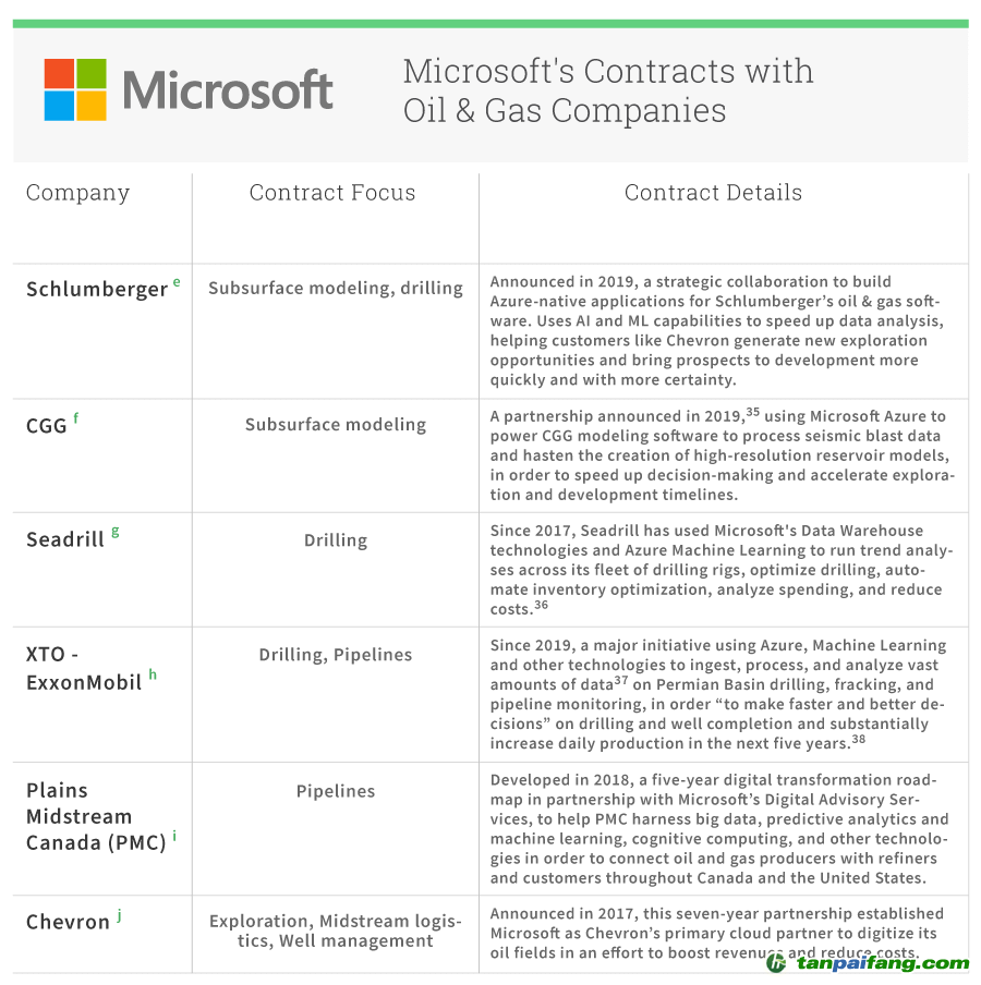 在油氣生產(chǎn)的每個階段都可以找到這些技術(shù)公司與油氣公司之間的合同,嚴(yán)重?fù)p害了像微軟、Google和Amazon這樣的公司所作的氣候承諾。