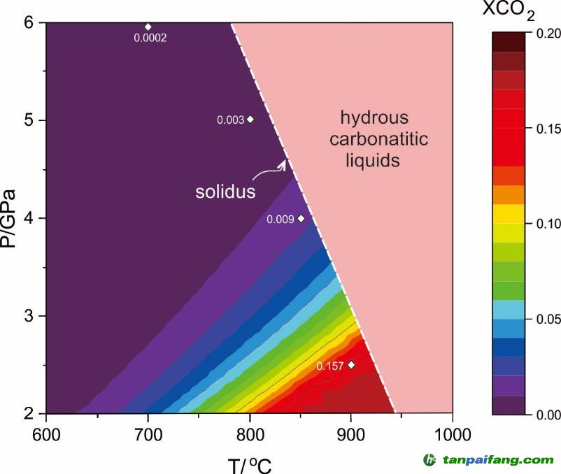 圖3. 熱力學(xué)模擬計(jì)算獲得的蛇綠碳酸巖固相線以下流體中CO2含量(摩爾比) 本+文`內(nèi).容.來(lái).自:中`國(guó)`碳`排*放*交*易^網(wǎng) t a np ai fan g.com