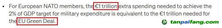 對(duì)于歐洲的北約成員國(guó)來(lái)說(shuō),為實(shí)現(xiàn)軍費(fèi)在GDP中占比2%的目標(biāo),它們需要額外支出1萬(wàn)億歐元,這恰恰相當(dāng)于它們自己制定的旨在到2050年前實(shí)現(xiàn)“碳中和”的“歐盟綠色協(xié)議”所需資金。