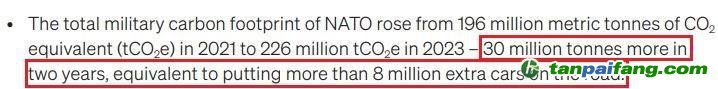 報(bào)告警告,北約的所作所為在助長(zhǎng)沖突的同時(shí)加速了氣候惡化,并引發(fā)新的軍備競(jìng)賽,從而又將進(jìn)一步增加碳排放,導(dǎo)致更多氣候行動(dòng)資金被挪用,并轉(zhuǎn)移世界對(duì)“氣候崩潰”這一人類(lèi)有史以來(lái)最大安全危機(jī)的注意力。 本%文$內(nèi)-容-來(lái)-自;中_國(guó)_碳|排 放_(tái)交-易^網(wǎng)^t an pa i fang . c om