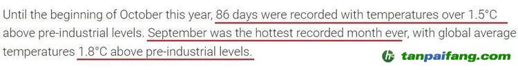 報(bào)告警告,截至10月初,今年已有86天的氣溫比工業(yè)化前水平高出1.5攝氏度以上。9月是有記錄以來(lái)最熱的月份,全球平均氣溫比工業(yè)化前水平高出1.8攝氏度。 本+文+內(nèi)/容/來(lái)/自:中-國(guó)-碳-排-放(交—易^網(wǎng)-tan pai fang . com