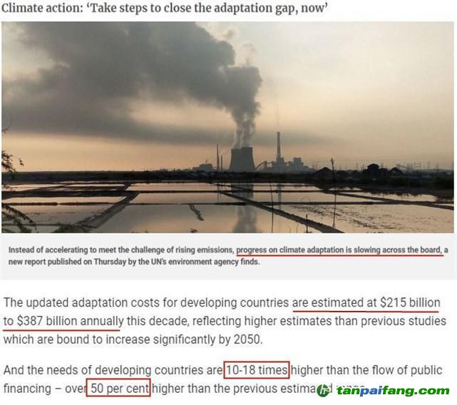 △聯(lián)合國(guó)環(huán)境規(guī)劃署官網(wǎng):據(jù)估算,目前發(fā)展中國(guó)家每年適應(yīng)氣候變化所需資金約為2150億美元至3870億美元,可資金缺口卻高達(dá)1940億美元至3660億美元,比之前估計(jì)的范圍高出50%以上。這其中的原因就在于,發(fā)達(dá)國(guó)家籌集的氣候援助資金僅為發(fā)展中國(guó)家所需資金的1/18到1/10。