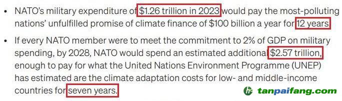 如果所有31個(gè)北約成員國(guó)的軍費(fèi)開(kāi)支全部達(dá)標(biāo),到2028年北約將額外支出約2.57萬(wàn)億美元軍費(fèi),這足以支付聯(lián)合國(guó)環(huán)境規(guī)劃署估計(jì)的中低收入國(guó)家7年的氣候適應(yīng)成本。