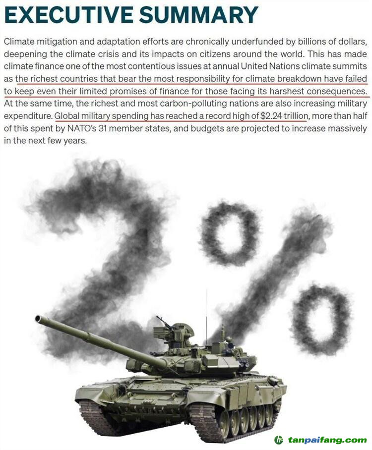 這份題為《氣候交火:北約占國(guó)內(nèi)生產(chǎn)總值2%的軍費(fèi)開(kāi)支如何加速氣候崩潰》的報(bào)告指出,對(duì)氣候危機(jī)負(fù)有最大責(zé)任的西方國(guó)家不僅未能兌現(xiàn)援助發(fā)展中國(guó)家的資金承諾,反而在通過(guò)不斷增加軍費(fèi)開(kāi)支大大增加軍事行動(dòng)碳排放。 本`文-內(nèi).容.來(lái).自:中`國(guó)^碳`排*放*交^易^網(wǎng) ta np ai fan g.com