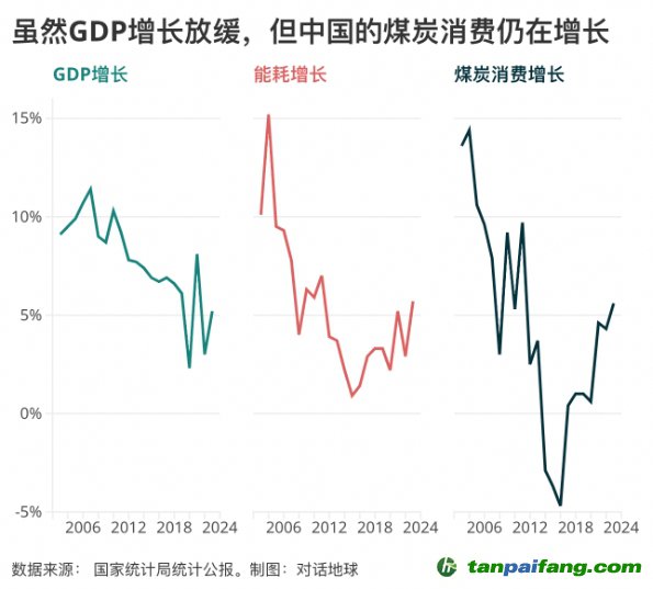 與此同時(shí),煤炭消費(fèi)量增幅連續(xù)第二年超過(guò)GDP增幅。對(duì)話地球梳理歷年的統(tǒng)計(jì)公報(bào)后發(fā)現(xiàn),上一次發(fā)生這樣的情況還是在二十年前統(tǒng)計(jì)公報(bào)里剛開始出現(xiàn)能源消費(fèi)量統(tǒng)計(jì)數(shù)據(jù)的時(shí)候:2003年到2005年,煤炭消費(fèi)量連續(xù)三年增速高于GDP增速。