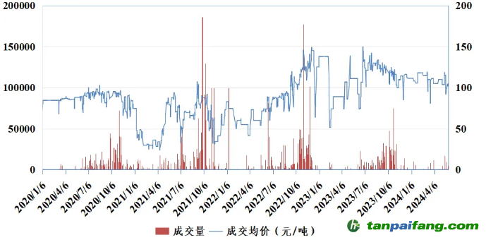 圖2 北京碳市場(chǎng)成交量?jī)r(jià)圖(2020年1月至2024年5月) 夲呅內(nèi)傛萊源亍:ф啯碳*排*放^鮫*易-網(wǎng) τā ńpāīfāńɡ.cōm