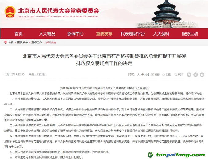 為保障北京地方碳市場(chǎng)(下簡(jiǎn)稱“北京碳市場(chǎng)”)建設(shè),2013年12月,北京市第十四屆人民代表大會(huì)常務(wù)委員會(huì)審議通過《關(guān)于北京市在嚴(yán)格控制碳排放總量前提下開展碳排放權(quán)交易試點(diǎn)工作的決定》,這是我國較早實(shí)施且為數(shù)不多的雙碳相關(guān)地方性法規(guī)。該法規(guī)中,從總量控制、碳排放配額管理和碳排放權(quán)交易制度、碳排放報(bào)告和第三方核查制度、處罰措施等方面,對(duì)北京碳市場(chǎng)建設(shè)運(yùn)行進(jìn)行了規(guī)范。該法規(guī)的發(fā)布為其他配套制度的設(shè)計(jì)制定提供了基礎(chǔ)依據(jù)。 禸嫆@唻洎:狆國湠棑倣茭昜蛧 τāńpāīfāńɡ.cōm
