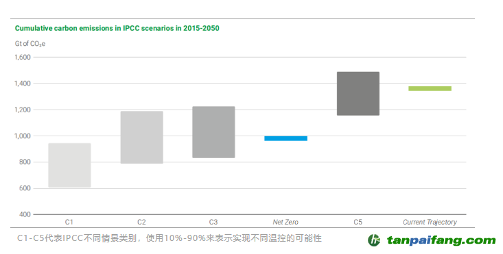 相比之下,“當(dāng)前路徑”下的累計(jì)碳排放量高于IPCC C5情景的中點(diǎn),C5情景指有超過(guò)50%的概率將溫升控制在2.5°C%。