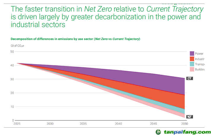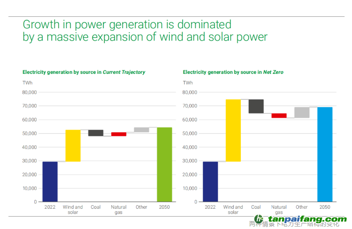 這得益于風(fēng)能和太陽(yáng)能的快速發(fā)展,在全球發(fā)電結(jié)構(gòu)當(dāng)中,風(fēng)能和太陽(yáng)能占比將從今天的10%增長(zhǎng)到2050年的50%(當(dāng)前情景)和70%(凈零情景),加速推動(dòng)能源替代。 本`文內(nèi).容.來(lái).自:中`國(guó)`碳`排*放*交*易^網(wǎng) t a npai fan g.com
