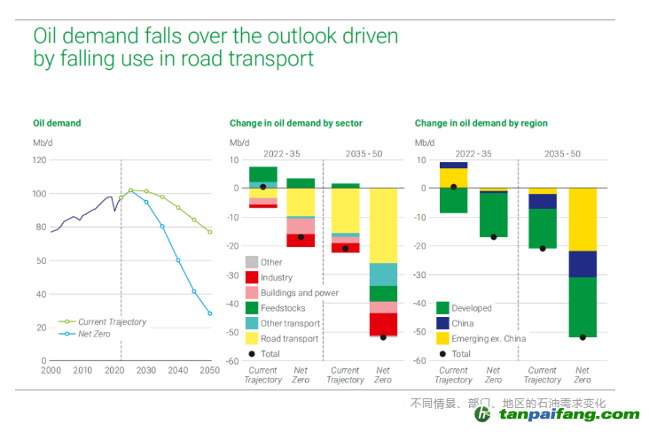 全球石油需求下降的主要驅(qū)動(dòng)力是交通部門(mén)能源效率提高和電氣化。在兩種情景之下,到2050年,電動(dòng)車(chē)數(shù)量將增加到12.5億甚至20億輛之間,而道路交通的石油使用量將從2022年的大概每天4,000多萬(wàn)桶下降到2050年的2,500萬(wàn)桶,甚至只有500萬(wàn)桶每天。 內(nèi)/容/來(lái)/自:中-國(guó)/碳-排*放^交%易#網(wǎng)-tan p a i fang . com