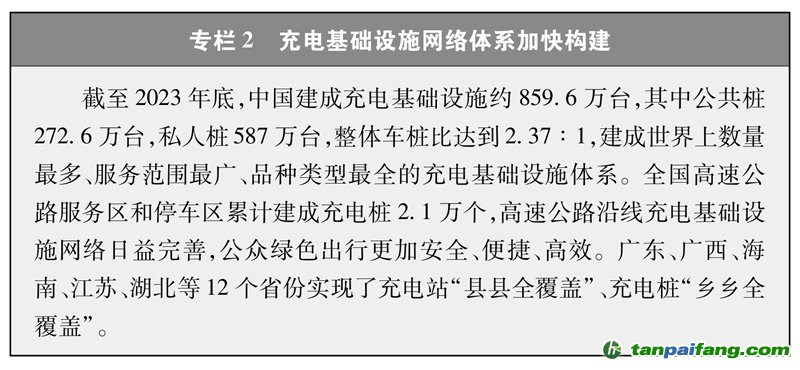 全方位構(gòu)建清潔高效的交通運輸體系。隨著經(jīng)濟社會發(fā)展,物流、出行需求不斷增加,交通用能還將持續(xù)增長。中國加快發(fā)展多式聯(lián)運,提高鐵路、水路在綜合運輸中的承運比重。深入推進城市公共交通優(yōu)先發(fā)展,構(gòu)建完善綠色出行服務(wù)體系,在城市客運領(lǐng)域推廣應用新能源車輛。機動車排放標準與世界先進水平接軌,基本淘汰國三及以下排放標準汽車。運輸能耗強度不斷下降,2023年鐵路單位運輸工作量綜合能耗較2013年下降約19%。大力發(fā)展充電基礎(chǔ)設(shè)施網(wǎng)絡(luò),完善加氫、加氣站點布局及服務(wù)設(shè)施。截至2023年底,累計建成充電基礎(chǔ)設(shè)施近860萬臺,加氫站超過450座。