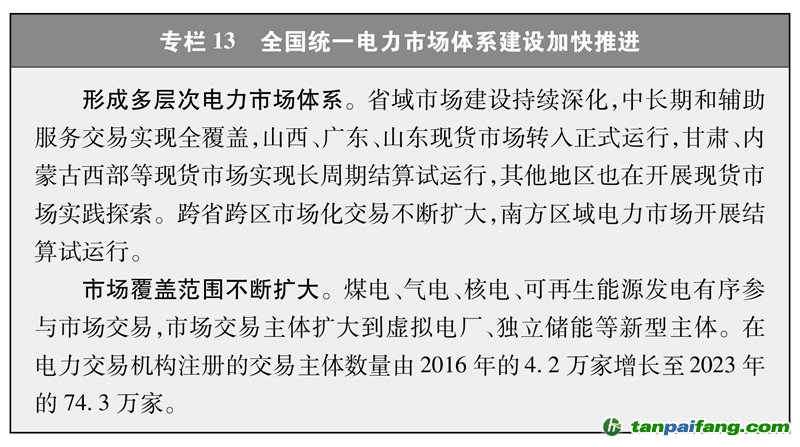 建設(shè)全國統(tǒng)一的能源市場。加快建設(shè)全國統(tǒng)一電力市場體系,省、區(qū)域、省間交易高效協(xié)同,中長期、現(xiàn)貨、輔助服務(wù)交易有機銜接。組建電力交易中心、石油天然氣交易中心和煤炭交易中心,搭建公開透明、功能完善的能源交易平臺。全國市場化交易電量占全社會用電量比重由2016年的17%提高到2023年的61.4%,2023年風電光伏市場化交易電量占風電光伏總發(fā)電量的47%,有力促進了電力資源的優(yōu)化配置和可再生能源的高效利用。