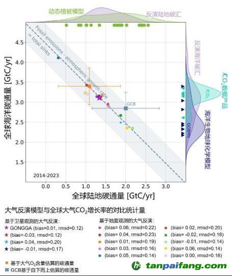全球陸地與海洋碳匯估算及各大氣反演模型與全球多年大氣二氧化碳增長率的對(duì)比統(tǒng)計(jì)量示意圖。中國科學(xué)院青藏高原研究所 供圖
