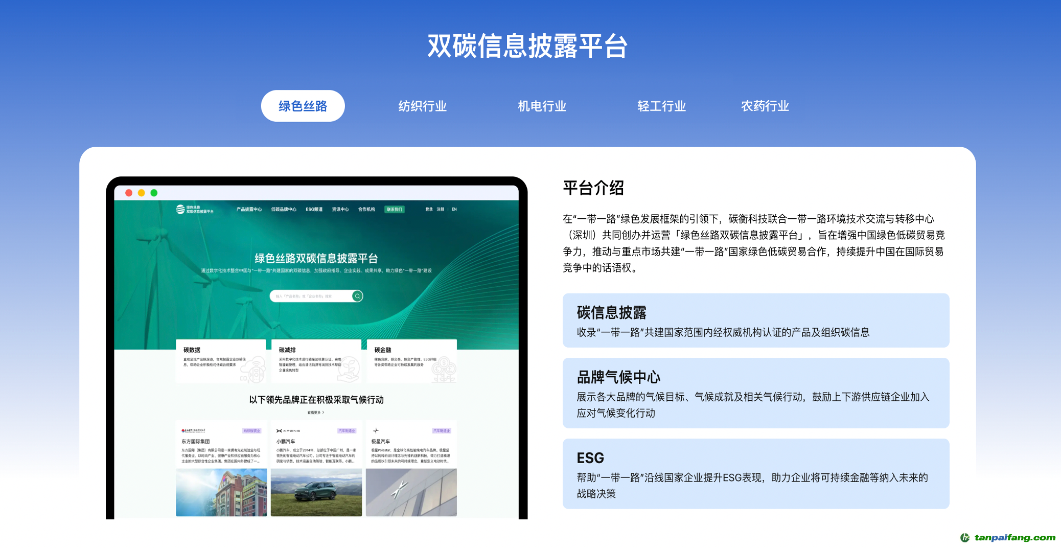 此外,碳衡科技還運營有五大公益性碳信息披露平臺,包括中國機電行業(yè)雙碳信息披露平臺、國際紡織服裝雙碳信息披露平臺、中國輕工工藝品雙碳信息披露平臺、綠色絲路雙碳信息披露平臺、中國農(nóng)藥行業(yè)雙碳信息披露平臺,利用數(shù)字化技術(shù)整合雙碳信息,助力企業(yè)和行業(yè)綠色低碳轉(zhuǎn)型,通過加強產(chǎn)業(yè)鏈上下游合作共享,共同應(yīng)對全球氣候變化風(fēng)險。 本/文-內(nèi)/容/來/自:中-國-碳-排-放-網(wǎng)-tan pai fang . com