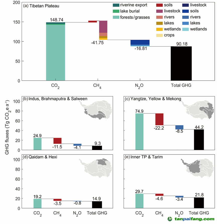 研究結(jié)果顯示,近20年來(lái),青藏高原生態(tài)系統(tǒng)是顯著的溫室氣體匯,每年從大氣中吸收近一億噸當(dāng)量二氧化碳,近兩倍于中國(guó)陸地生態(tài)系統(tǒng)溫室氣體匯。這一顯著的溫室氣體匯主要源于二氧化碳匯。然而,超40%二氧化碳匯被非二氧化碳溫室氣體排放所抵消,其中,畜牧業(yè)和內(nèi)陸水體(包括熱融喀斯特湖)的年排放量分別占二氧化碳匯的21%和13%(圖1)。值得注意的是,高原生態(tài)系統(tǒng)溫室氣體匯幾乎中和了高原能源與工業(yè)產(chǎn)生的溫室氣體排放。 本`文@內(nèi)-容-來(lái)-自;中^國(guó)_碳0排0放^交-易=網(wǎng) ta n pa i fa ng . co m