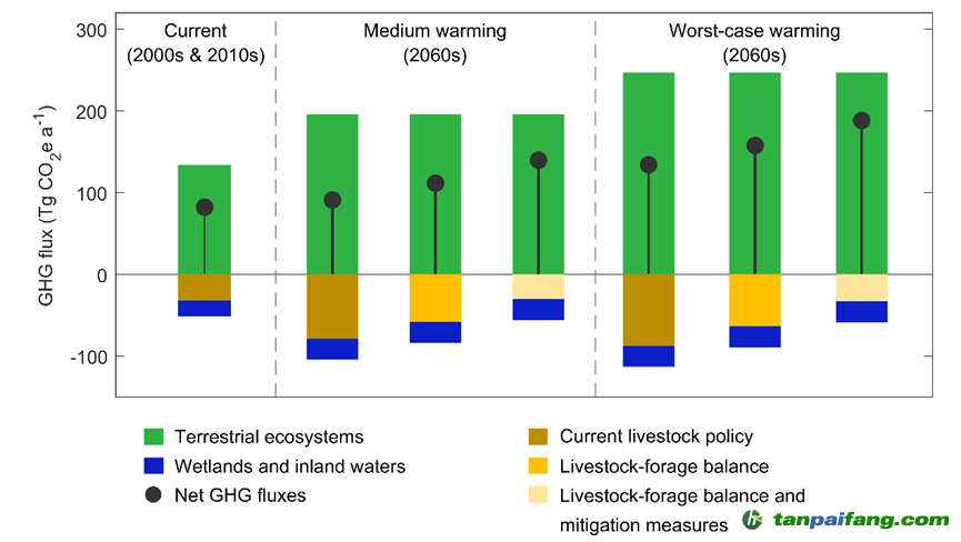 研究進(jìn)一步發(fā)現(xiàn),在中等排放情景下,未來(lái)生態(tài)系統(tǒng)二氧化碳匯持續(xù)增強(qiáng),水體擴(kuò)張和多年凍土持續(xù)退化等導(dǎo)致的非二氧化碳溫室氣體排放仍將不及二氧化碳匯,因此,到2060年高原仍是顯著的溫室氣體匯。然而,溫室氣體匯大小依賴于高原畜牧業(yè)未來(lái)發(fā)展路徑的選擇:如果仍維持當(dāng)前不可持續(xù)的放牧狀態(tài),畜牧業(yè)的非二氧化碳溫室氣體排放的增加將完全抵消生態(tài)系統(tǒng)二氧化碳匯增量;有效實(shí)施草畜平衡管理并開(kāi)展減排措施以降低牲畜非二氧化碳溫室氣體排放強(qiáng)度,高原溫室氣體匯大小預(yù)計(jì)將比當(dāng)前增加1.5倍(圖2),因此,推進(jìn)可持續(xù)且高效的畜牧業(yè)發(fā)展路徑將大幅減少高原畜牧業(yè)溫室氣體排放,增強(qiáng)青藏高原對(duì)我國(guó)碳中和戰(zhàn)略的貢獻(xiàn)。