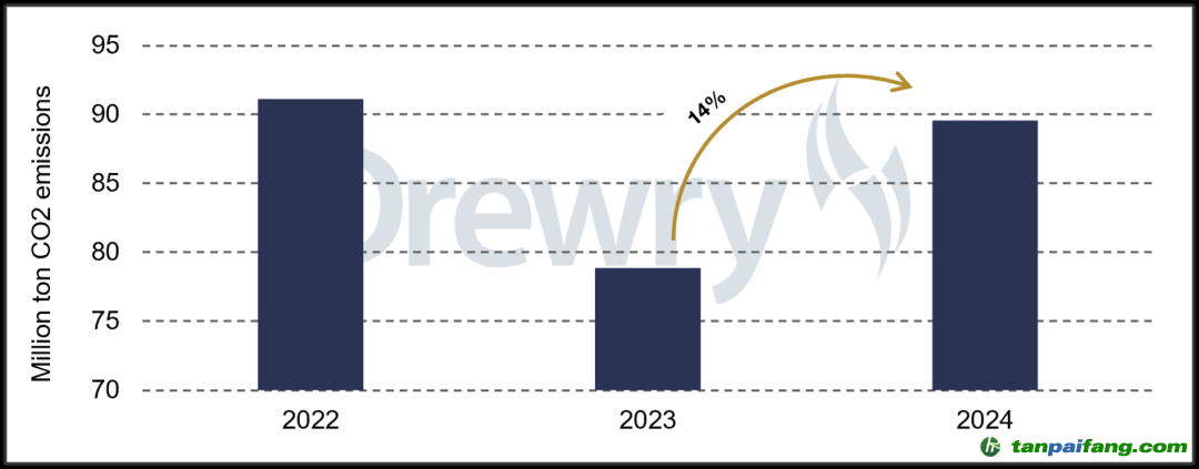 Drewry稱,2024年航運(yùn)業(yè)在歐盟排放交易體系(EU ETS)范圍內(nèi)的二氧化碳排放量約為9000萬噸,比上一年增長了約14%。 內(nèi)-容-來-自;中_國_碳_0排放¥交-易=網(wǎng) t an pa i fa ng . c om