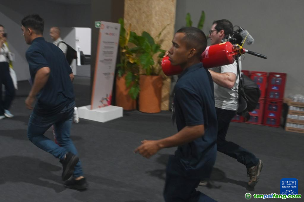 11月20日,在巴西帕拉州貝倫市《聯(lián)合國氣候變化框架公約》第三十次締約方大會(huì)(COP30)會(huì)場內(nèi),消防員與工作人員開展檢查。新華社發(fā)(盧西奧·塔沃拉 攝)