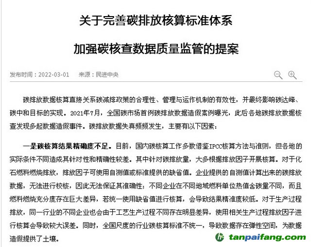全國兩會(huì)即將召開之際,民進(jìn)中央一份題為《關(guān)于完善碳排放核算標(biāo)準(zhǔn)體系,加強(qiáng)碳核查數(shù)據(jù)質(zhì)量監(jiān)管的提案》指出,碳核查數(shù)據(jù)不準(zhǔn)確直接影響科學(xué)決策的出臺(tái),同時(shí)數(shù)據(jù)造假行為影響碳市場的公平性,不利于“雙碳”目標(biāo)達(dá)成。失真碳核查數(shù)據(jù)公開有損我國政府公信力,影響我國國際聲譽(yù),影響我國氣候變化國際談判的有效性,對(duì)國家利益造成損失。