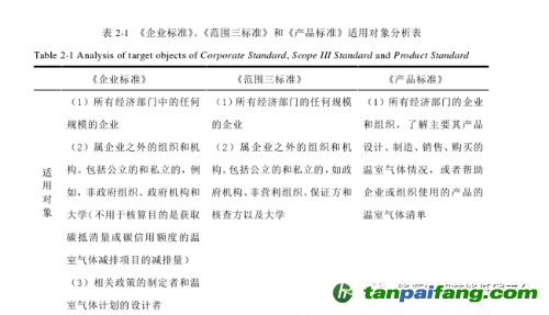 溫室氣體核算體系是針對(duì)企業(yè)、組織或者減排項(xiàng)目進(jìn)行溫室氣體核算的方法體系。體系的組成中最主要的是以下的三大標(biāo)準(zhǔn):《溫室氣體核算體系:企業(yè)核算與報(bào)告標(biāo)準(zhǔn)(2011)》(下文稱《企業(yè)標(biāo)準(zhǔn)》)、《溫室氣體核算體系:產(chǎn)品壽命周期核算和報(bào)告標(biāo)準(zhǔn)(2011)》(下文稱《產(chǎn)品標(biāo)準(zhǔn)》)、《溫室氣體核算體系:企業(yè)價(jià)值鏈(范圍三)核算與報(bào)告標(biāo)準(zhǔn)(2011)》(下文稱《范圍三標(biāo)準(zhǔn)》),這三個(gè)標(biāo)準(zhǔn)主要針對(duì)的對(duì)象在細(xì)節(jié)上有一定的差異,如表 2-1 所示。
