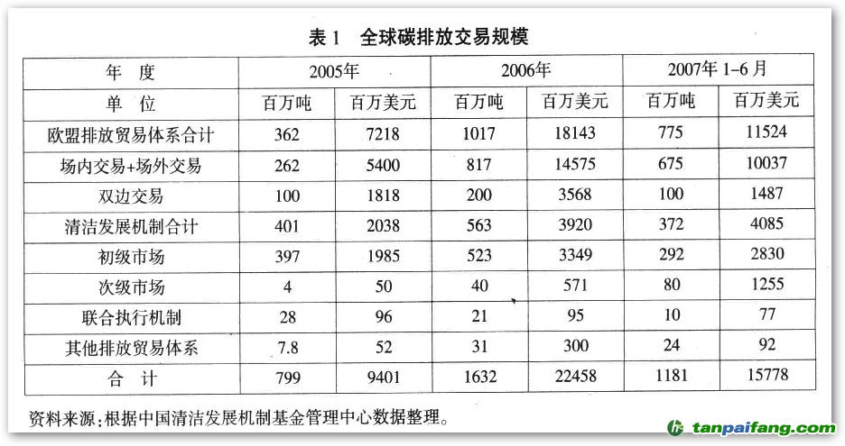 拍賣)的。京都議定書下的國(guó)際排放貿(mào)易(ETS)機(jī)制就是以配額交易為基礎(chǔ)的。在該機(jī)制下,人們采用總量管制和排放交易(cap&trade)的管理和交易模式,即:環(huán)境管理者會(huì)設(shè)置一個(gè)排放量的上限。受該體系管轄的每個(gè)企業(yè)將從環(huán)境管理者那里分配到相應(yīng)數(shù)量的“分配數(shù)量單位”(AAU),每個(gè)分配數(shù)量單位等于1噸C02當(dāng)量。如果在承諾期中這些企業(yè)的溫室氣體排放量低于該分配數(shù)量,則剩余的AAU(代表排放溫室氣體的許可權(quán))可以通過國(guó)際市場(chǎng)有償轉(zhuǎn)讓給那些實(shí)際排放水平高于其承諾而面臨違約風(fēng)險(xiǎn)的附件一國(guó)家企業(yè),以獲取利潤(rùn);反之,則必須到市場(chǎng)上購(gòu)買超額的“分配數(shù)量單位”(AAU),否則將會(huì)被處以重罰。隨著《京都議定書》生效,溫室氣體排放權(quán)交易市場(chǎng)得到了迅速的發(fā)展和擴(kuò)張,已成為全球貿(mào)易中的最新亮點(diǎn)。從2005年到2006年,僅僅一年間,市場(chǎng)規(guī)模就從近100億美元迅速攀升至220億美元,而2007年上半年的交易量比2006年同期又有近30%的增長(zhǎng)。具體數(shù)值參見表l。