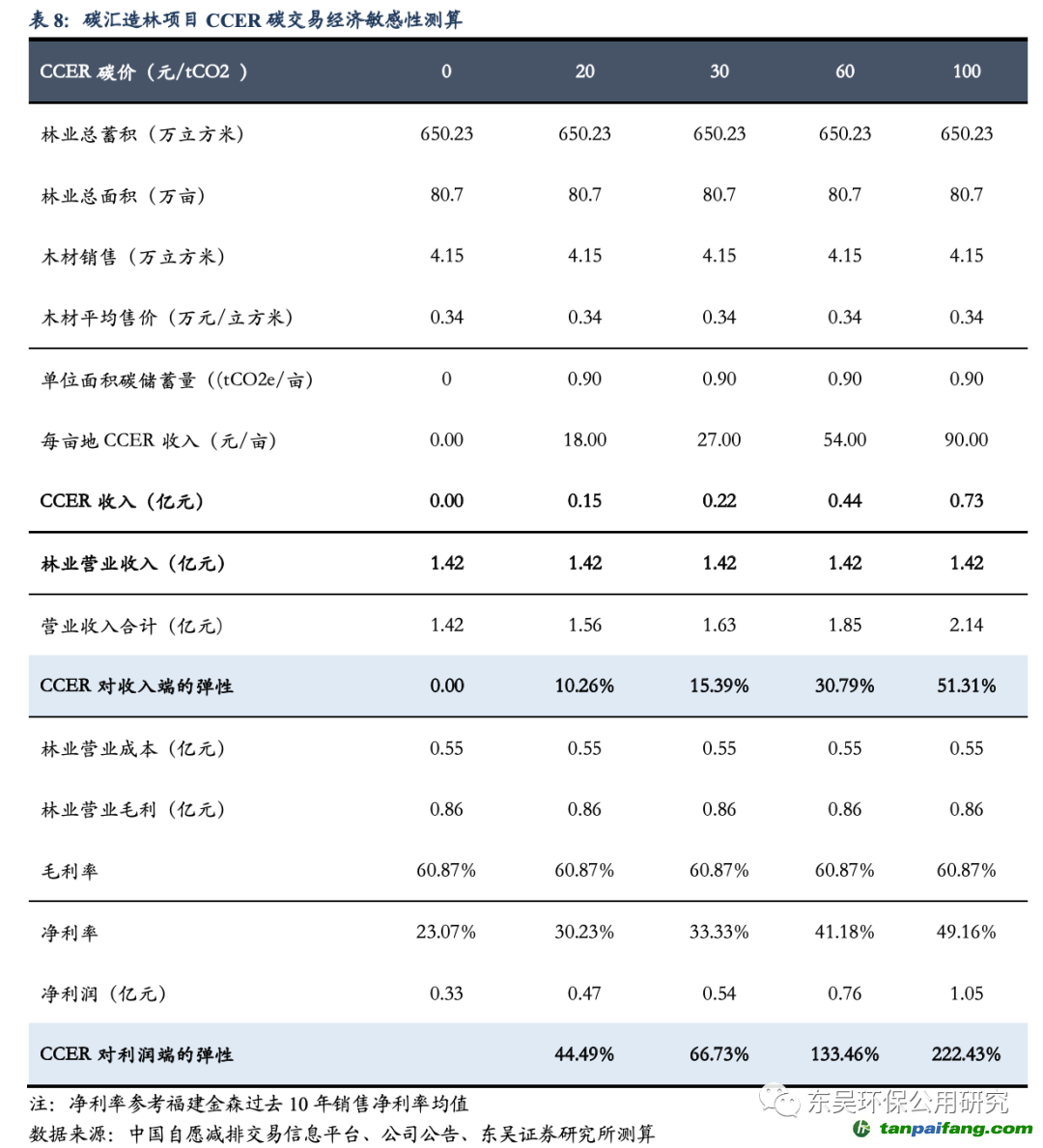 碳匯造林經(jīng)濟(jì)效益測(cè)算:CCER碳價(jià)30元情景下,每畝林地CCER收入達(dá)27.00元,對(duì)林業(yè)碳匯項(xiàng)目收入端彈性達(dá)15.39%,利潤(rùn)端彈性達(dá)66.73%,凈利率提升10.26pct至33.33%;CCER碳價(jià)60元情景下,每畝林地CCER收入達(dá)54.00元,對(duì)林業(yè)碳匯項(xiàng)目收入端彈性達(dá)30.79%,利潤(rùn)端彈性達(dá)133.46%,凈利率提升18.11pct至41.18%。 本文`內(nèi)-容-來(lái)-自;中_國(guó)_碳_交^易=網(wǎng) tan pa i fa ng . c om