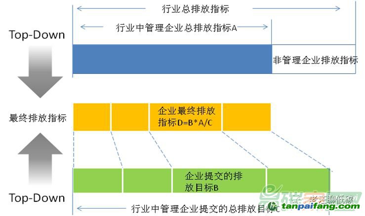 政府在收到企業(yè)的減排目標及減排計劃后,會根據(jù)企業(yè)自身能力及總體的減排目標進行調整,調整總體思路是自上而下(Top-Down)與自下而上(Button-Up)相結合的方式。具體操作如下-根據(jù)國家總體減排目標(韓國的BAU對比降低30%)以行業(yè)為基準制定總體排放指標(減排指標)A-某個企業(yè)提交的經過政府認證的排放指標為B-經過政府認證的,考慮到行業(yè)內各企業(yè)的合理的排放目標(由企業(yè)提供)總和為C-則每個企業(yè)的最終排放指標D則為B×A/C