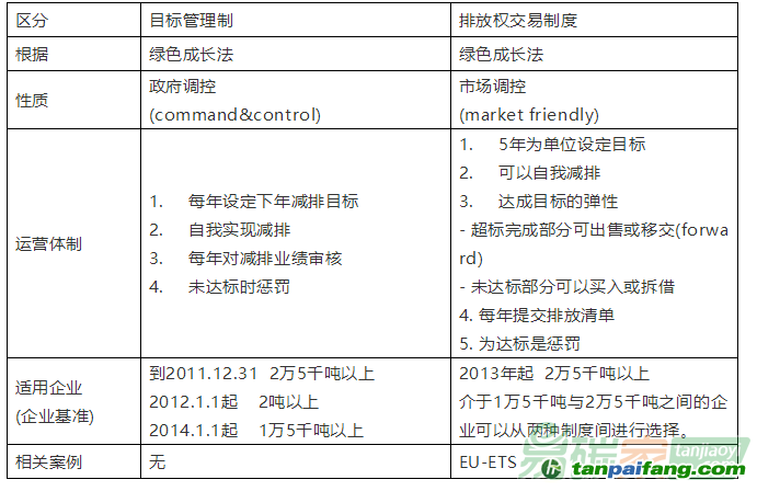 2010年11月,韓國在推出能源溫室氣體目標(biāo)管理制后不久又推出了排放權(quán)交易制度,目的是借由市場(chǎng)化機(jī)制幫助企業(yè)實(shí)現(xiàn)減排目標(biāo)。雖然是為溫室氣體目標(biāo)管理服務(wù)的,但是與溫室氣體目標(biāo)管理制是一個(gè)平行的制度,兩種制度比較如下: