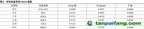 從以上實(shí)證分析結(jié)果看,各個碳金融交易市場的Hurst值相差較大,這是因?yàn)槲覈]有形成統(tǒng)一的碳排放交易市場,每個碳排放交易試點(diǎn)的開始時間、參與主體、政策干預(yù)、市場環(huán)境等因素都存在著巨大差異,這就導(dǎo)致了各個不同樣本的時間序列存在不同的特征和走勢,其Hurst值也有所不同。 本`文@內(nèi)-容-來-自;中_國_碳排0放_交-易=網(wǎng) t an pa ifa ng . c om
