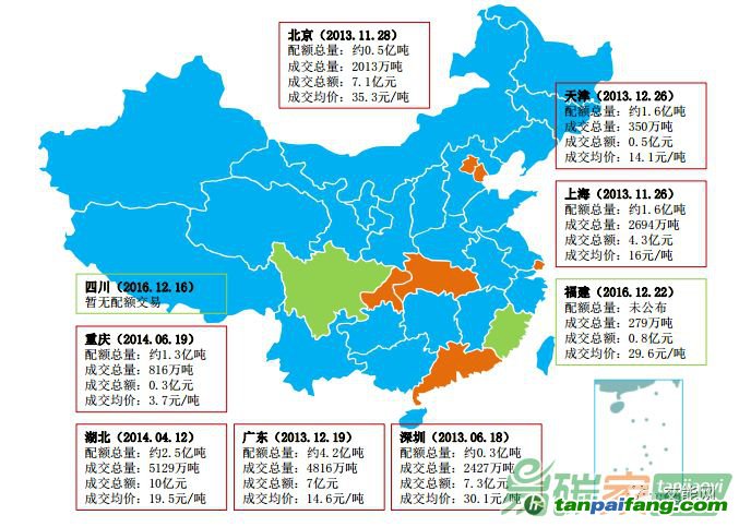 北京市、天津市、上海市、重慶市、廣東省、湖北省、深圳市啟動7個碳交易試點。7個試點啟動以來,碳交易市場十分活躍,截止到2017年12月31日,七省市試點碳市場及福建碳市場配額累計成交量為1.85億噸。