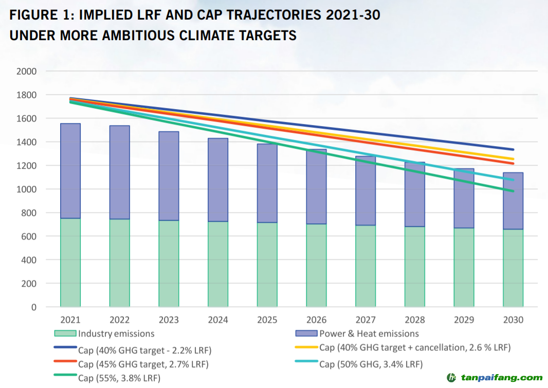 圖7:歐洲碳市場2021至2030年排放量預(yù)測以及不同2030減排目標(biāo)下的Cap(百萬噸)(數(shù)據(jù)來源:Refinitiv碳研究,IETA 2019 GREENHOUSE GAS MARKET REPORT)