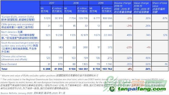 從全球來看,碳排放配額的交易總量在2018年迅猛增長了45%之后,在2019年下降了約4%。