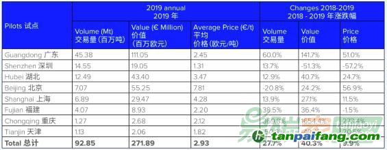 圖:2019 年中國碳排放交易體系試點交易匯總(圖表來源:路孚特碳市場年度回顧)