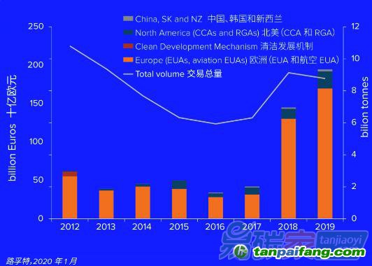圖:2012 - 2019 年全球碳市場各個細分市場的交易價值、交易總量(圖表來源:路孚特碳市場年度回顧)