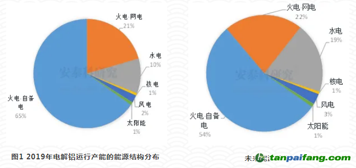 我國電解鋁行業(yè)用電模式分為自備電和網(wǎng)電。2019年底自備電所占比例約為65%,均為火力發(fā)電;網(wǎng)電所占比例約為35%,其中火力發(fā)電約占21%,