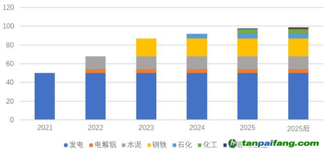 圖1 全國碳市場重點碳排放行業(yè)納入順序及規(guī)模變化預(yù)估圖(單位:億噸)
