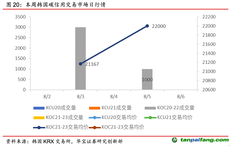 本周韓國(guó)碳市場(chǎng)交易活躍度有所提升。相比上周,本周KAU20總成交量為17.84萬(wàn)噸,同比上升368.36%,總成交額為40.19億韓元,同比上升396.31%,線上交易均價(jià)22529.05韓元/噸,同比上升5.97%。本周無(wú)協(xié)議交易。 本文+內(nèi)-容-來(lái)-自;中^國(guó)_碳+排.放_(tái)交^易=網(wǎng) t a n pa ifa ng .c om