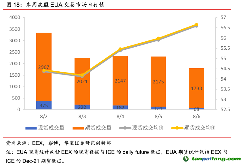 本周歐洲能源交易所(EEX)舉行了5次EUA配額拍賣(mài),成交量754.65萬(wàn)噸,同比下降50%。其中,歐盟拍賣(mài)3次,波蘭拍賣(mài)1次,德國(guó)拍賣(mài)1次;成交均價(jià)55歐元/噸,相比上周上漲3.79%。 本文@內(nèi)/容/來(lái)/自:中-國(guó)-碳^排-放-交易&*網(wǎng)-tan pai fang . com