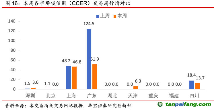本周CCER交易量同比下降36.85%,線上線下(51.830, 0.00, 0.00%)交易活躍度均有所下降。本周廣東碳試點(diǎn)CCER交易量有較大幅度下滑,同比下降58.31%,此外上海、北京、四川等碳試點(diǎn)CCER交易也均有所下滑。深圳、天津交易量有所上升,湖北、福建、重慶仍舊無(wú)成交。 內(nèi).容.來(lái).自:中`國(guó)*碳-排*放*交*易^網(wǎng) t a npai fa ng.com