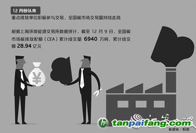 環(huán)交所”)數(shù)據(jù)統(tǒng)計,截至12月9日,全國碳市場碳排放配額(CEA)累計成交量6940萬噸,累計成交額28.94億元。