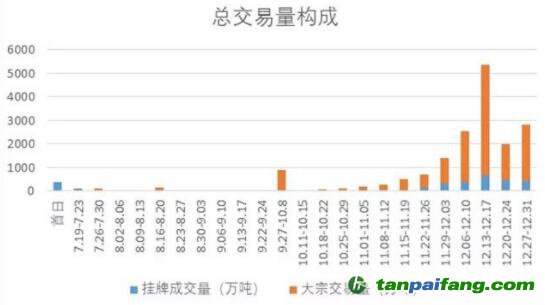 一是價(jià)格(掛牌價(jià))較為穩(wěn)定,整體呈不規(guī)則“浴盆”曲線。如圖1,全國碳市場價(jià)格整體在40-60元之間,開市首周實(shí)現(xiàn)了價(jià)格的較快上漲,短暫突破60元,其后1個(gè)月內(nèi)價(jià)格呈下降趨勢(shì),隨后價(jià)格長期維持在43元上下橫盤。橫盤期也是成交量急劇縮量期(如圖2)。進(jìn)入12月份,隨著履約截止日迫近,成交量快速放量,價(jià)格持續(xù)上升。半年周期來看,價(jià)格周K圖呈不規(guī)則“浴盆”曲線,平均掛牌價(jià)格為47.16元/噸。