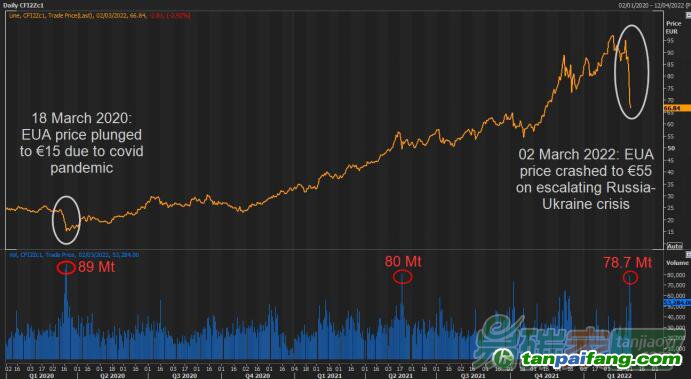 近幾日內(nèi),不斷升級的俄烏沖突使得悲觀情緒籠罩歐洲碳市場,投資者紛紛減倉和大幅甩賣碳配額。3月1日,碳價暴跌近20%,12月期貨交易量則高達(dá)7870萬噸。這幾乎是EUA標(biāo)桿合約日交易量的歷史最高水平,接近于2020年3月18日的8900萬噸日交易量。