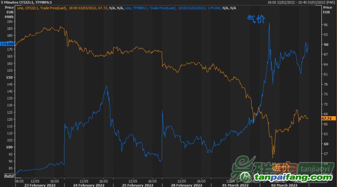 碳價(jià)的走勢(shì)和能源市場(chǎng)完全相反。因?yàn)閾?dān)心俄羅斯的能源供給受到影響,全球石油天然氣和煤炭?jī)r(jià)格以及大宗商品等都因?yàn)槎頌蹙謩?shì)而飆升。布倫特原油價(jià)格漲至8年新高110美元。歐洲近月TTF天然氣從2月23日的75歐元每MWh漲至近200歐元。煤炭?jī)r(jià)格則從此前的不到200美元每噸漲到最高450美元每噸。