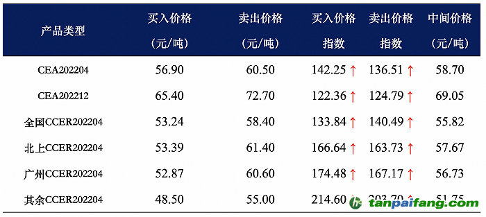 履約使用的CCER買入價格預期為52.87元/噸,賣出價格預期為60.60元/噸,中間價為56.73元/噸;買入價格指數(shù)為174.48,賣出價格指數(shù)為167.17,中間價格指數(shù)為170.50。4月其他