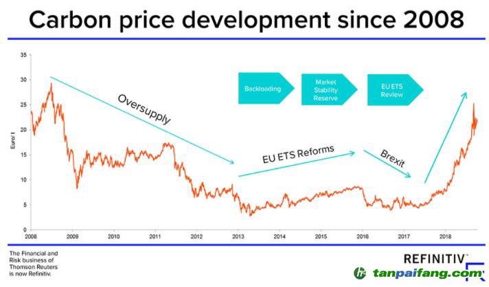 歐洲碳價(jià)格自2018年初開(kāi)始反彈,從1月的8歐元/噸上升到9月的25歐元/噸的峰值,價(jià)格波動(dòng)很大。
