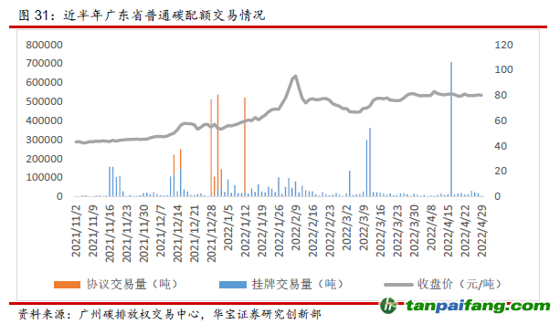 截止2022年5月4日,廣東省碳市場2021履約年度對碳減排量的需求和供給總量均呈現(xiàn)下降趨勢。PHCER與CCER共同構(gòu)成廣東省碳排放權(quán)交易市場的抵消機制,因此廣東省碳減排量為CCER與PHCER。對需求端進行分析,廣東省2021履約年度的抵消規(guī)則是,在抵消比例不變的情況下,可用于抵消的PHCER與CCER總量上限下降為100萬噸,下降幅度為33.33%。而具體抵消流程是,首先優(yōu)先消納本省CCER和PHCER,然后按照企業(yè)書面申請先后順序允許用以抵消(可用于抵消的CCER和PHCER總量原則上控制在100萬噸以內(nèi)),即先到先得。這意味著,2021履約年度對碳減排量的總需求量有大幅降低,而由于“先到先得”的規(guī)則以及2022年廣東碳價的大幅走高,單個企業(yè)對碳減排量的需求依舊景氣,在履約年度內(nèi)或隨時間由高降低。對供給端進行分析,首先CCER備案早已停止,其次從PHCER備案項目看,根據(jù)廣州碳排放權(quán)交易中心和廣東省生態(tài)環(huán)境廳公告統(tǒng)計,截至2022年5月4日,廣東省備案PHCER減排量達191.97萬噸,項目類型以林業(yè)碳匯為主,占比達92%,從2021年5月12日之后廣東省生態(tài)環(huán)境廳政府信息公開平臺并無新增PHCER減排量備案公告,即2021履約年度(2021-7-21起2022-6-20)目前PHCER碳減排量的供給為0噸,PHCER碳減排量的供給近兩個履約期呈下降趨勢。由此可見,廣東省碳市場2021履約年度碳減排量的供給總量呈現(xiàn)下降趨勢。